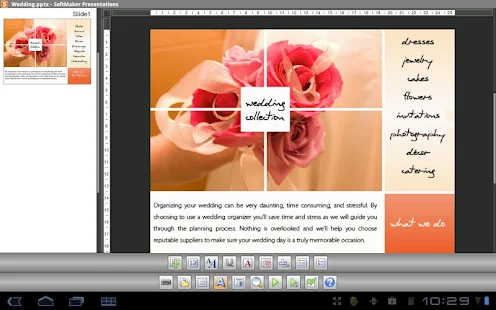 O SoftMaker Presentations Mobile é o único programa de apresentações para Android que permite abrir, editar e salvar todos os seus documentos PowerPoint, preservando todas as formatações e conteúdos. Exibe suas apresentações exatamente como são exibidas em seu computador, inclusive o som, as animações e as transições de slide.