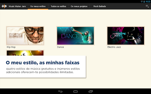 O MAGIX MUSIC MAKER JAM apresenta uma utilização intuitiva, que faz da criação musical uma experiência única. Para que estejas sempre no ritmo certo, todos os samples da aplicação estão perfeitamente sincronizados entre si. Os quatro estilos musicais gratuitos Hip Hop, Dance, Electric Jazz e Rock Ballads oferecem mais de 1000 loops, com os quais poderás fazer experiências e improvisar.