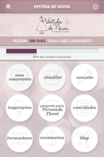 Aplicativo do blog Vestida de Noiva para guiar os noivos na organização do casamento, com checklist completo, inspirações, respostas às dúvidas, planilha de orçamento e convidado e muito mais!